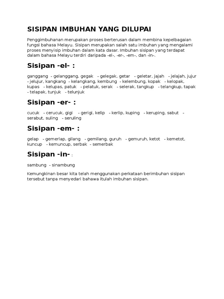 Sisipan adalah imbuhan yang terletak di dalam kata. Sisipan infiks infix adalah imbuhan yang terletak di dalam kata. Menjadikan makna perbuatan kata dasar sebagai kiasan.
